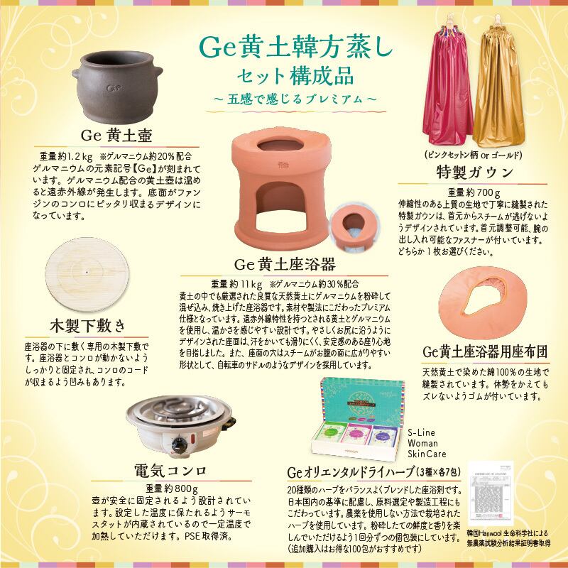ワンランク上のサロン仕様のGe黄土韓方蒸しフルセットです。