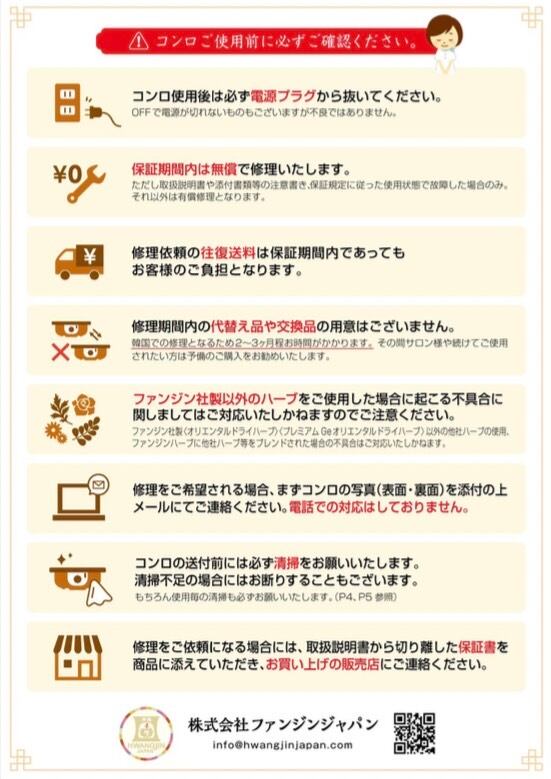 メーカー証明書/イラスト付き取扱説明書/コンロ保証書/各種チラシ(生薬一覧、生薬効能、韓方スチームセラピー、座り方、デトックス)
