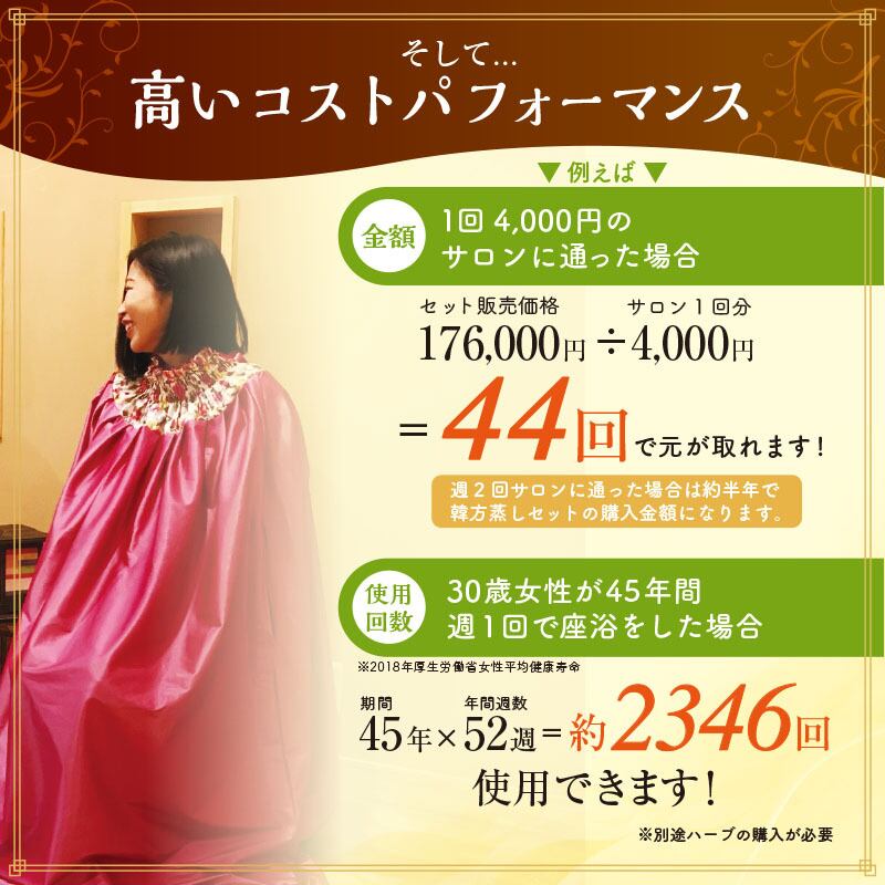 黄土韓方蒸し基本セットに、サロン開業に必要な黄土壺、ガウン・座布団の予備が含まれたとてもお得なセットです。